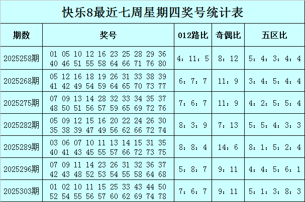 福彩快乐8第2025303期(上周四)开奖回顾:01 02 10 11 15 25 33 43 44 50 52 54 55 56 57 60 62 69 74 78,其中奖号012路比为7:6:7,奇偶比为9:11,五区比为5:1:3:8:3。